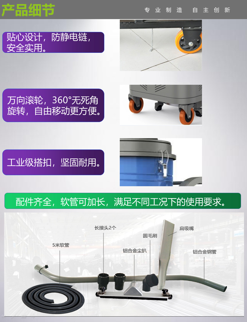5、标配大口径吸尘配件:S弯管、吸尘趴头、扁吸嘴、圆毛刷、5米EVA吸尘软管。比传统吸尘器配件工作面积更大,吸尘面积更广,快速清理灰尘、铁屑等需吸取的物质。