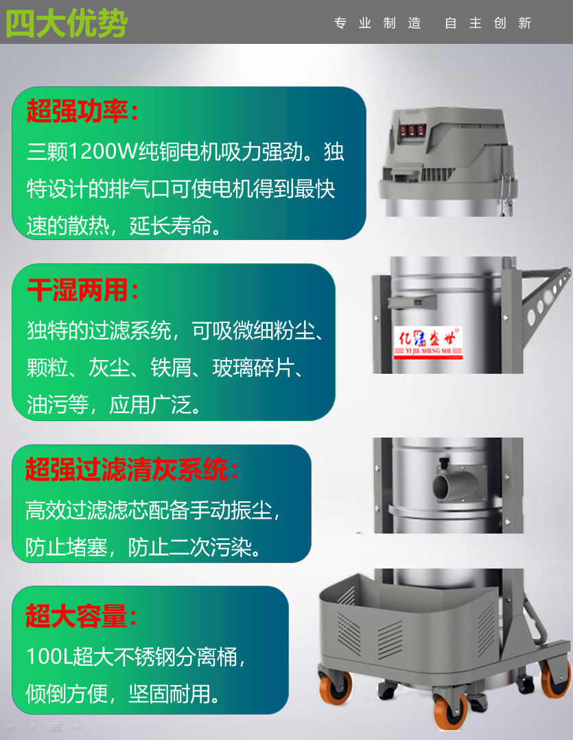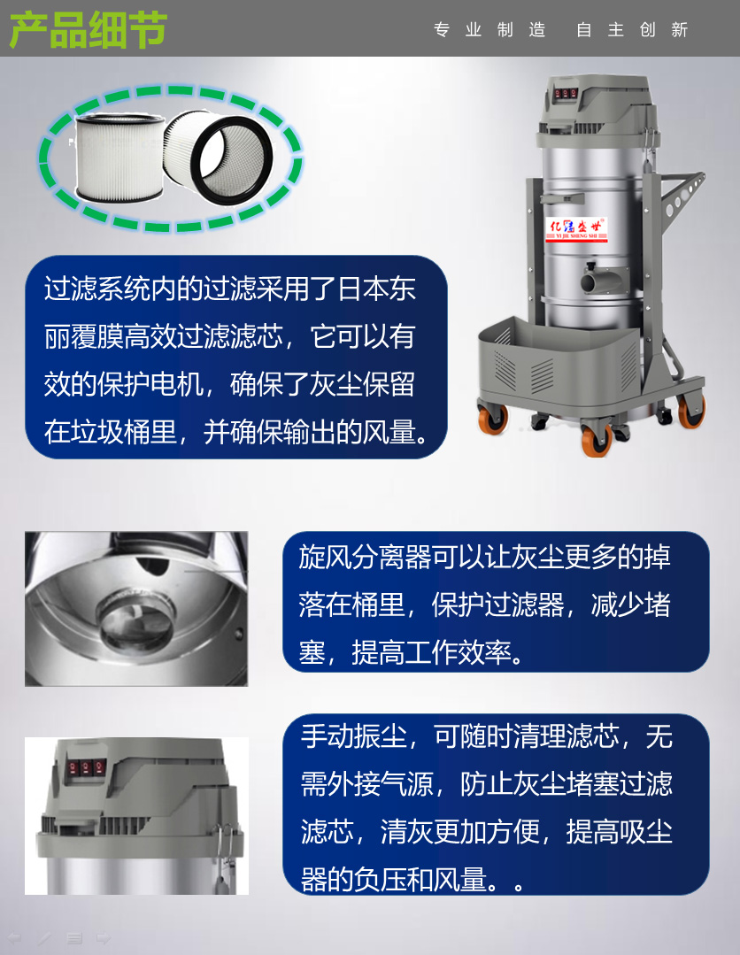 配置反吹清灰系统,机器在工作过程中可以清理滤芯上的灰尘,无需外接气源,在任何时间都可以清洁过滤滤芯,防止灰尘堵塞过滤滤芯,使滤芯更不容易堵塞,清灰更加方便,提高工业吸尘器的负压和风量。