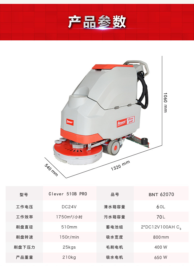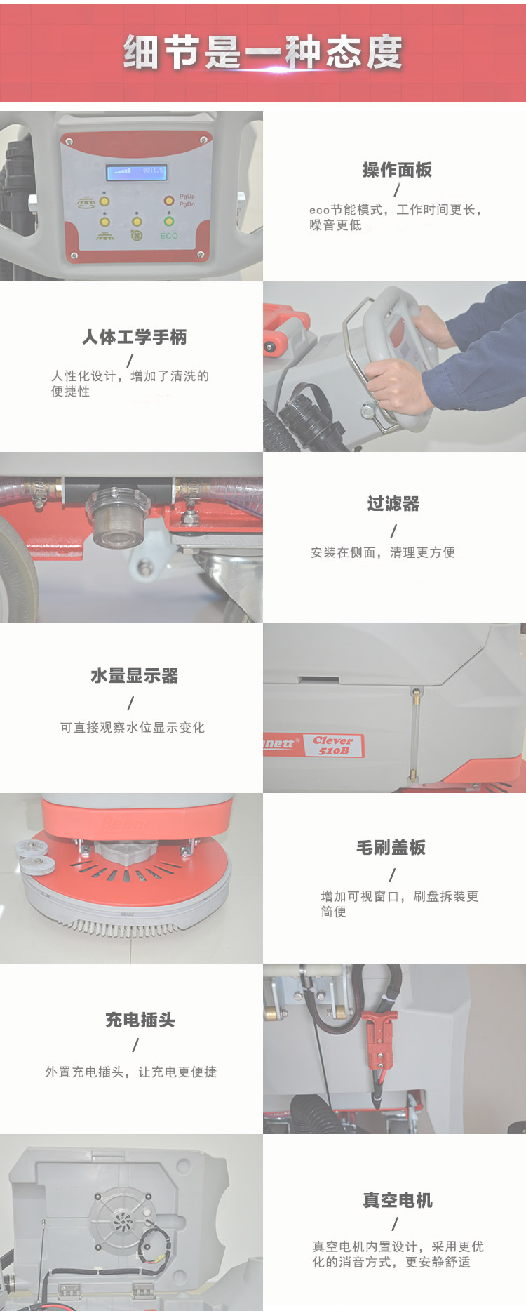 1、配有水量显示器,可直接观察水位变化2、双万向轮,更坚固耐用,不易损坏3、广口注水口,注水更快捷便利4、清水过滤器安装在侧面,清理更方便5、污水箱侧翻式设计,更轻松,便捷6、吸污管外置,人性化设计,增加了清洗的便捷性7、污水箱敞口设计,让清洗更便捷8、人体工学手柄,人性化设计,满足了各类身高人群的需求9、外置充电插头,让充电更便捷10、刷盘盖板增加可视窗口,刷盘安装拆卸更简便11、真空电机内置设计,采用更优化的消音方式 ,更安静,更舒适12、eco节能模式(Clever 510B PRO),工作时间更长,噪音更少